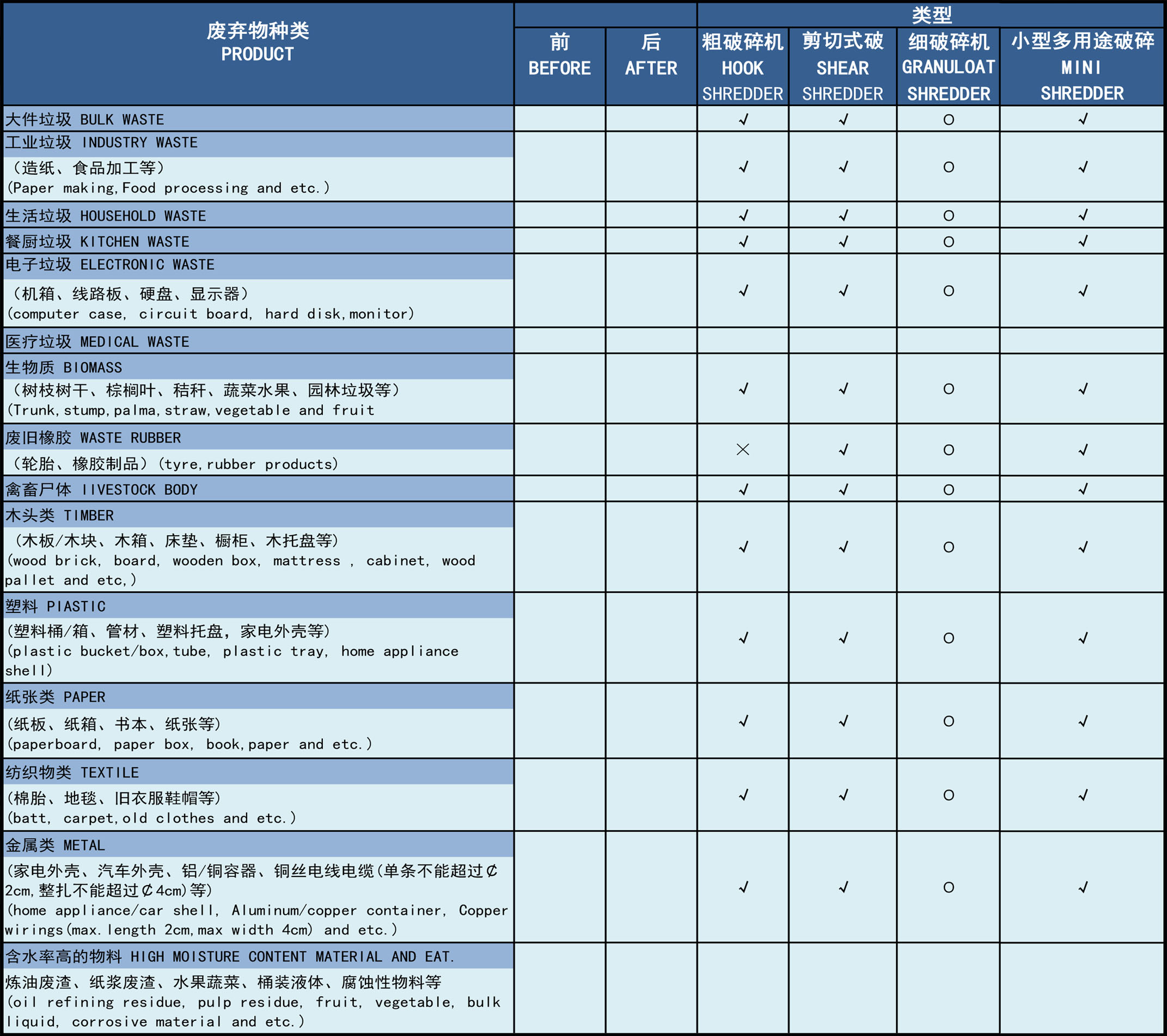 環(huán)創(chuàng )破袋機(粗破碎機),低轉速,大扭矩,用于破碎生活垃圾、大件垃圾、工業(yè)垃圾、廢舊木材等,將大件的垃圾破碎成200*250mm的碎塊,廣泛用于垃圾衍生物料生產(chǎn)和垃圾焚燒發(fā)電等領(lǐng)域的初步破碎,處理量大,維護成本低,可靠性好。整套設備包括電機、減速機、兩組刀片軸、料斗、支架、PLC控制柜等組成。它通過(guò)兩組動(dòng)刀軸相向旋轉,與定刀合力剪切、撕扯、擠壓來(lái)減小物料的尺寸。該機型處理量極大,每小時(shí)處理量從10噸到100噸可選。物料的碎后粒徑200*250mm。